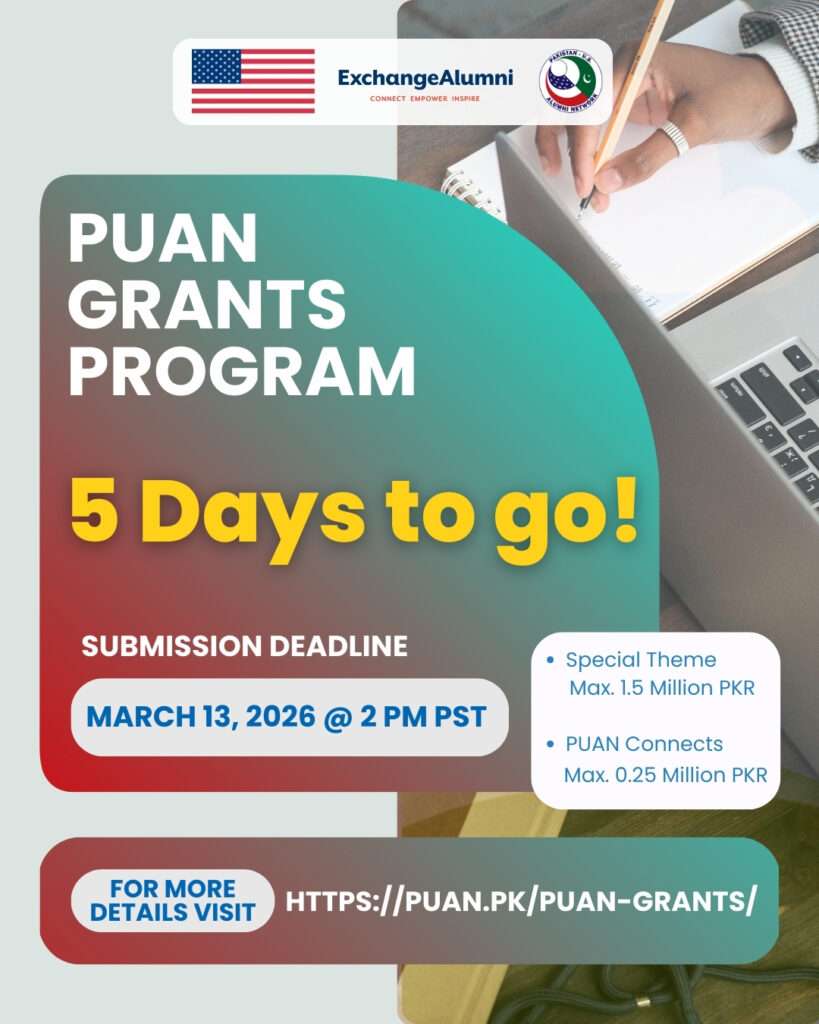 The Pakistan–U.S. Alumni Network (PUAN) reminds alumni that there are only five days left to submit applications for the PUAN Grants Program 2026. Alumni with innovative ideas for community-driven initiatives are encouraged to apply and take advantage of this opportunity to turn their ideas into impactful projects.