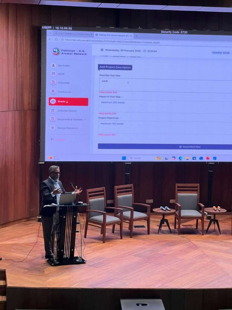 The momentum continued in Islamabad on February 18, where approximately 70 alumni gathered at USEFP for an engaging session. The workshop was attended by Marta Aparicio (Public Diplomacy Officer, U.S. Embassy Islamabad) and Peter (Executive Director, USEFP), reflecting the strong institutional support behind alumni-led initiatives. During the session, Muhammad Sarfraz Khan (Senior Finance/Grants Officer, PUAN, Islamabad) delivered a comprehensive orientation on the PUAN Grants Program 2026, outlining key priorities, funding tracks, and the application process. The session concluded with an interactive Q&A that addressed alumni queries and encouraged thoughtful proposal planning.