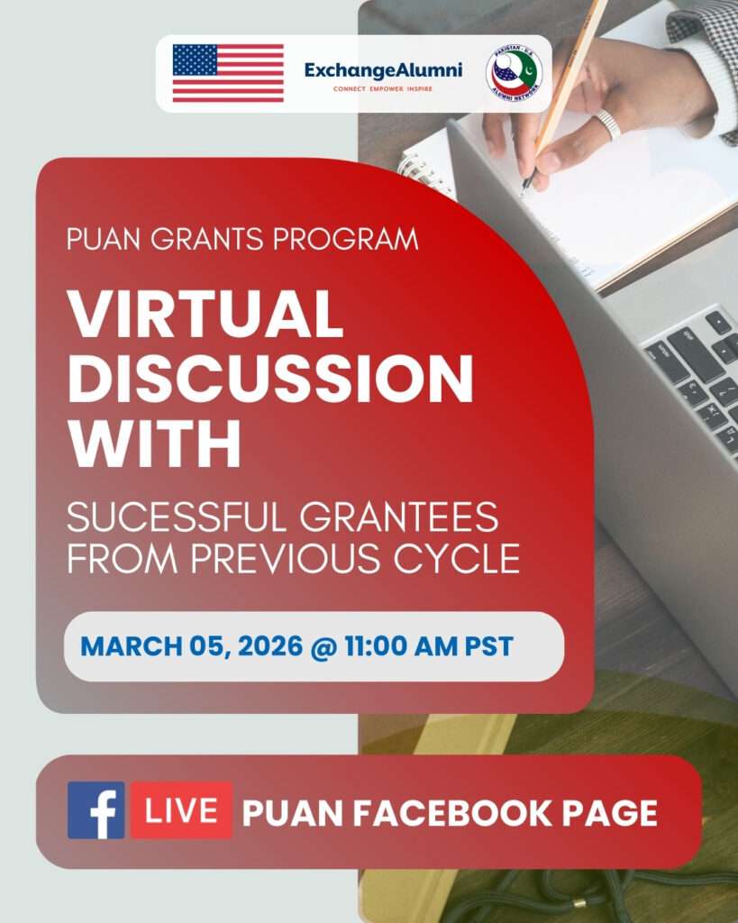 The Pakistan-U.S. Alumni Network (PUAN) invites alumni of U.S. government-funded exchange programs to join an upcoming Live Q&A Session with successful PUAN grantees from the previous cycle. The session aims to inspire and guide potential applicants for the PUAN Grants Program 2026 by sharing practical insights from alumni who have successfully designed and implemented PUAN-funded projects.