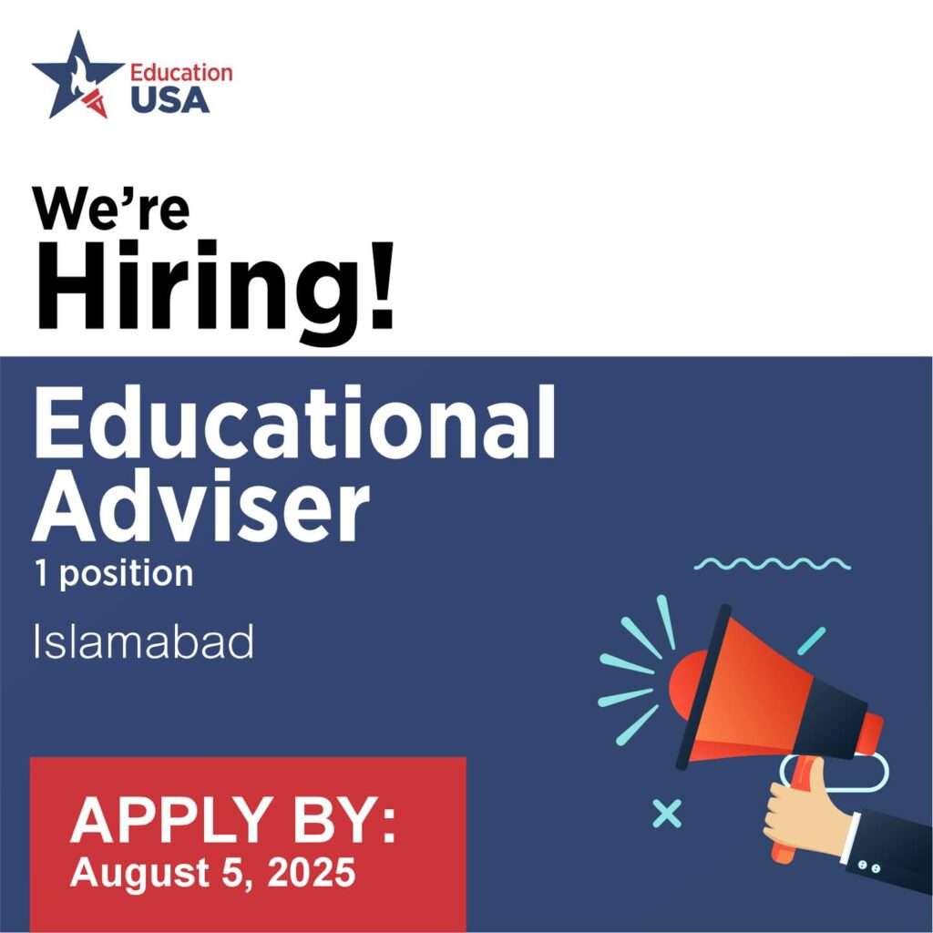 We’re Hiring! Education USA Pakistan has a vacancy for an Educational Adviser in Islamabad. This entry-level role is ideal for recent grads or early-career professionals with strong English skills, public speaking experience, and a passion for U.S. higher education. U.S./international degree or experience preferred.